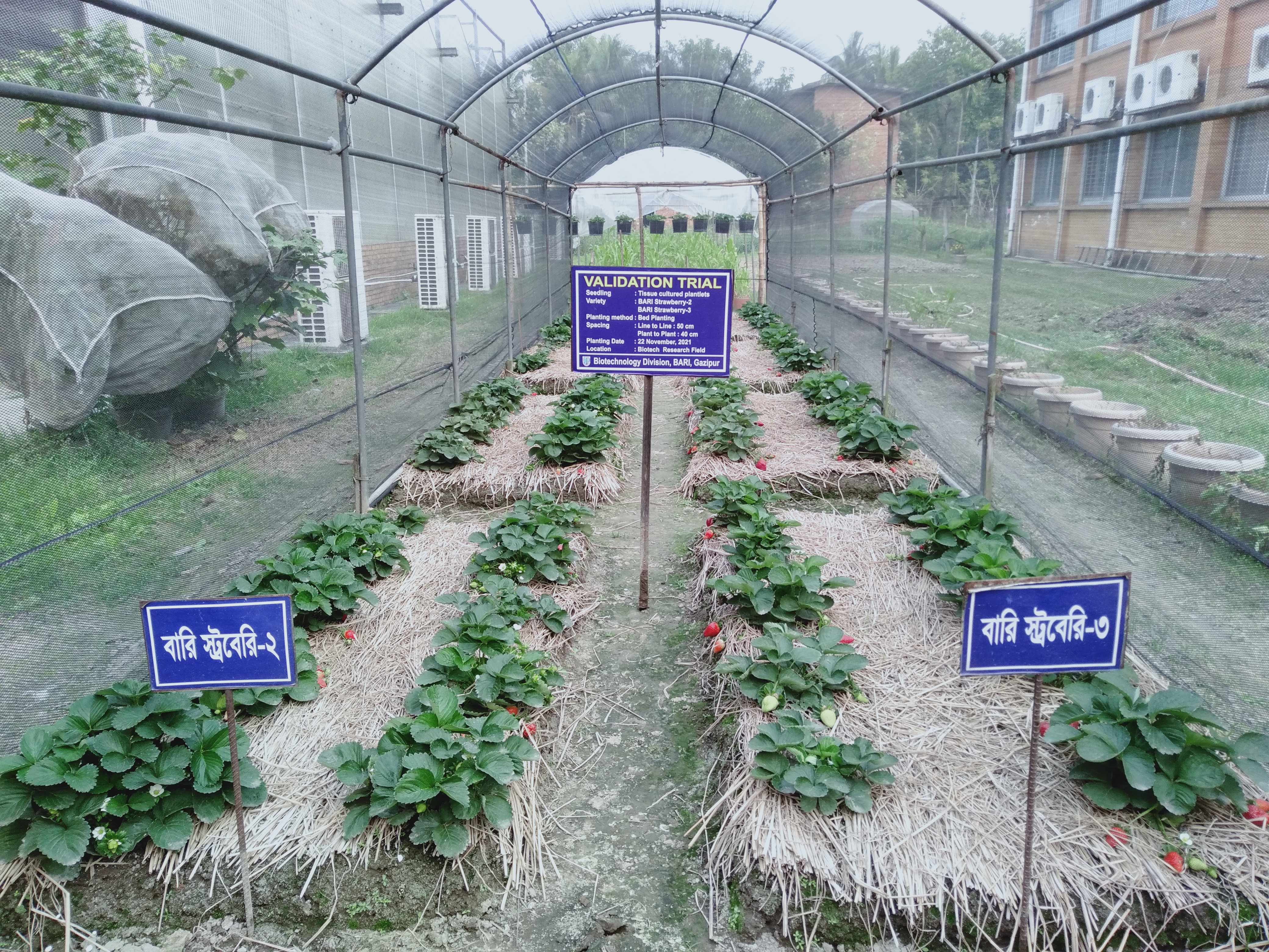 Complete genome sequencing of tomato leaf curl virus, development of 4 Bt brinjal varieties are some of the success stories of Biotechnology division, BARI. Research on late blight resistant GM potato, leaf curl resistant tomato, shoot and fruit borer resistant brinjal and pulse crops, coat protein gene sequencing of papaya ringspot virus is going one. Till now the division has developed anther culture protocol for barley and maize. Micropropagation protocol for fruits i.e. banana (BARI Kola-1,2,3,4), jackfruit, pineapple, Malta, watermelon, strawberry, rape, pumelo; flowers i.e. gladiolus, tuberose, orchids, chrysanthemum, gerbera, dahlia, rose; spices ie. Zinger, chili etc. Regeneration protocols of brinjal, tomato, papaya, potato, okra, sweet gourd, soybean are achievement of this division.